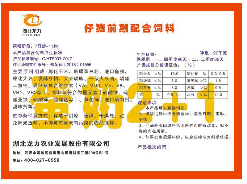 湖北龍力農(nóng)業(yè)發(fā)展股份有限公司坐落于武漢市黃陂區(qū)前川街向陽街群順三里298號附1號。公司成立于2014年6月,公司自成立以來把“創(chuàng)全球最大養(yǎng)豬綜合服務(wù)”為企業(yè)愿景。致力于打造教保料品牌”作為公司發(fā)展的明確目標。公司一直致力于豬營養(yǎng)的研究和開發(fā),積極與國內(nèi)外高校和科研機構(gòu)合作,推廣養(yǎng)豬技術(shù)、動物營養(yǎng)新概念,向世界農(nóng)牧企業(yè)學習與合作。公司采用國內(nèi)先進的生產(chǎn)工藝,選擇高精度電子配料秤,高均勻度、無殘留混合機等先進設(shè)備....